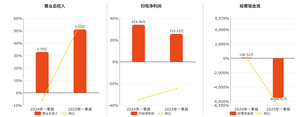 公司营业总收入为3.65亿元,在已披露的同业公司中排名第47。归母净利润为319.22万元,在已披露的同业公司中排名第66,较去年同报告期归母净利润减少104.84万元,同比较去年同期下降24.72%。经营活动现金净流入为-6998.41万元,在已披露的同业公司中排名第48,较去年同报告期经营活动现金净流入减少7106.92万元,同比较去年同期下降6549.11%。
